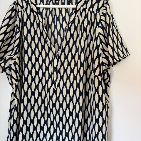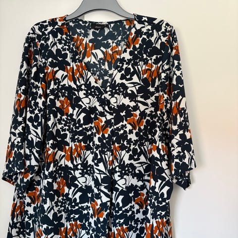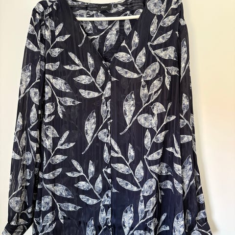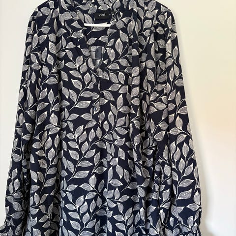 Zizzi bluse i str XL i sort bundfarve med bladprint i lyse og brune nuancer. Løs model med 3/4-ærmer og rund hals.