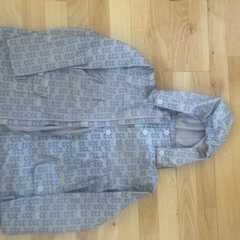 Multifarvet Wheat Gore-Tex jakke til pige i str 104 med hætte og lynlås foran. Har trykknapper, sidelommer og blomsterprint over det hele.