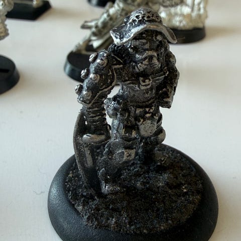 Samling af små grå plastikfigurer på runde baser, klar til maling eller spil. Flere forskellige positurer med sværd, skjold og spyd, så der er lidt blandet i gruppen. 25 stk