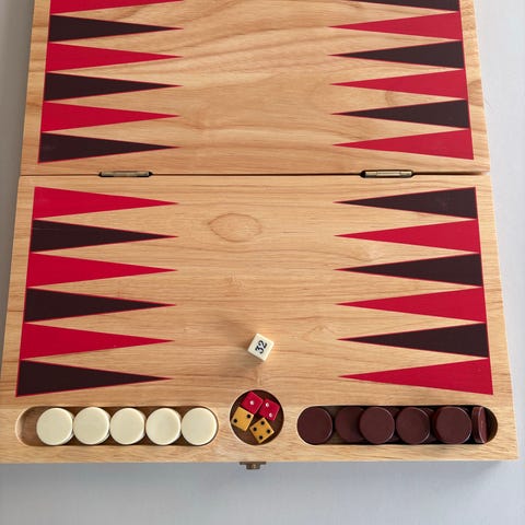 Backgammon brætspil i massivt træ med brikker og terninger. Klassisk udgave på kvadratisk spilleplade med to farver brikker.