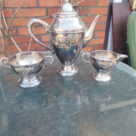 Kaffe og Te sæt med sukker og fløde skål , i plet sølv . Vægt 2 kg . Kan sendes med GLS.