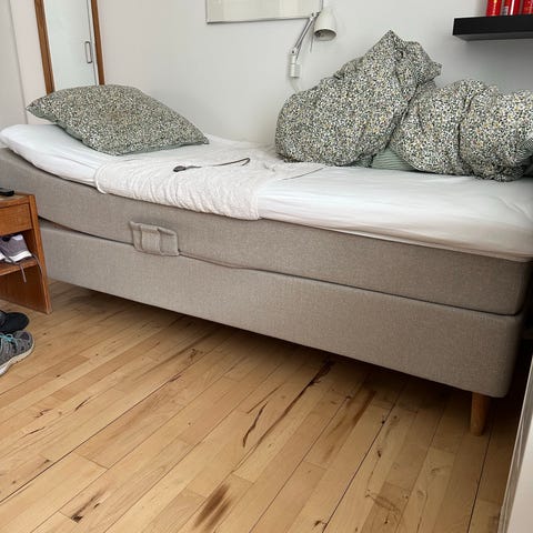IKEA boxmadras med topmadras, enkeltseng i grå med sorte ben. Neutral stil der passer nemt ind i de fleste rum.