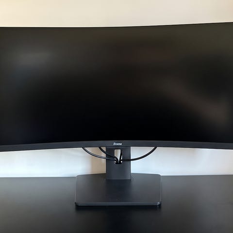 Dahua LM34-E330C 34" buet PC-skærm med HDMI-indgang. Står på slankt stativ og har strøm-/tilslutningskabel med på billedet.
