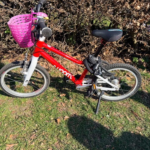 Lilla Woom børnecykel med 16" hjul og håndbremser. Har skærme og almindelige pedaler, klar til en mindre cyklist.