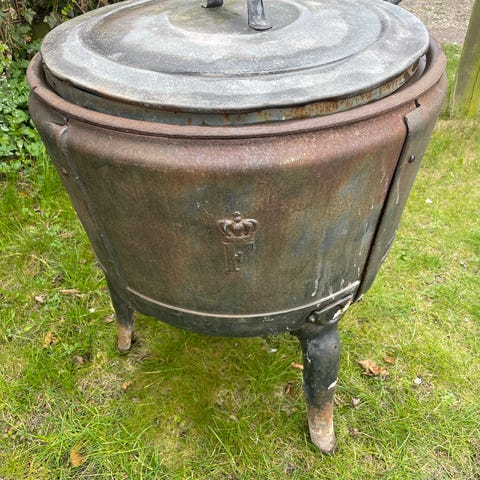 Stor galvaniseret metalspand med låg og solide sidehåndtag. Låget har greb foroven og hul i midten, og spanden står stabilt på flad bund.