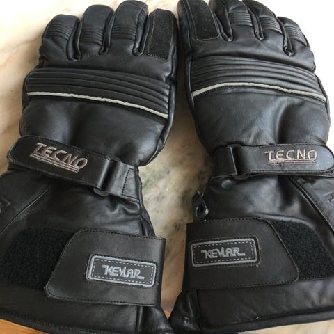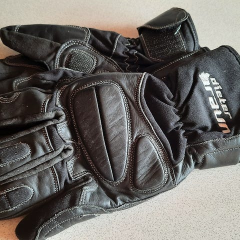 Motorcykelhandsker fra Dieter Braun i str 12, sorte med forstærkninger på knoer og håndflade. Har justerbar lukning ved håndleddet.