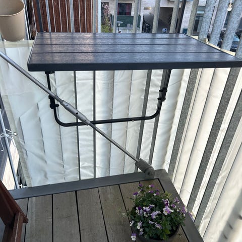IKEA TORPARO praktisk hvidt altanbord der hænger på gelænderet. Bordet har solidt beslag under til støtte.