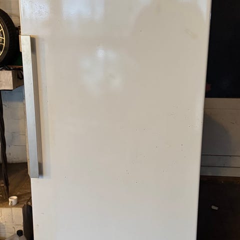 Velfungerende køleskab på 116 liter. Det har nogle ridser og der mangler et par af justeringsskruerne, så der skal bare lige et par små træ eller plastic klodser til at justere med. Vi har brugt det i et fortelt på en campingplads.