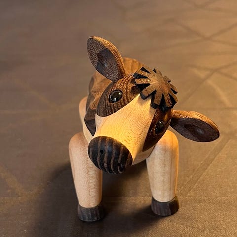 Spring Copenhagen Dandy ko i træ, designet af Chresten Sommer. Lavet i lyse og mørke træsorter med bevægelige ben og hale.