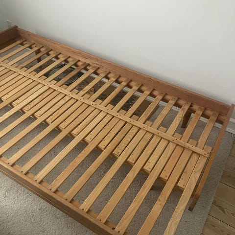 Sengeramme i fyrretræ med ryglæn fra 80-erne, Nyt i Bo. Madrasmål 120 x 200. Madras medfølger ikke.