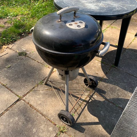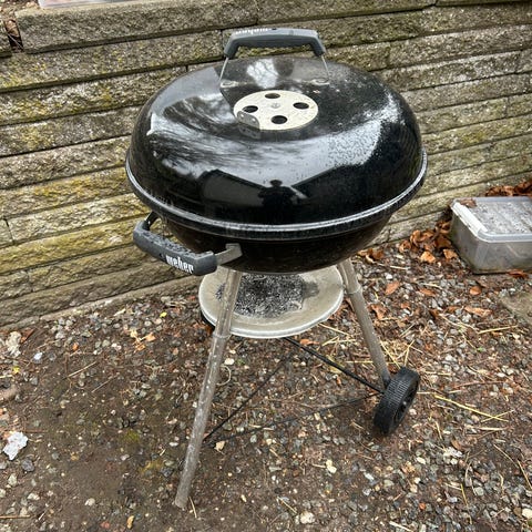 Kuglegrill med låg og luftspjæld, stående på ben med hjul så den er nem at flytte rundt i haven. Rist og kulbeholder følger med på billederne, og der er håndtag i siderne til at løfte låget af og på.