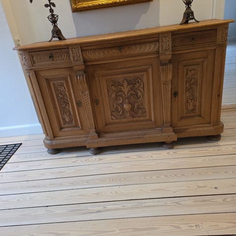 Egetræsskænk med bord og stole, 1904 år gl., b: 135 d: 60 h: 235