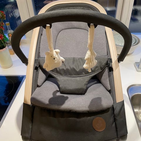 coco bloom baby lounget stylewood babywippe. Sorte seler er af nappa. Bøgetræ.