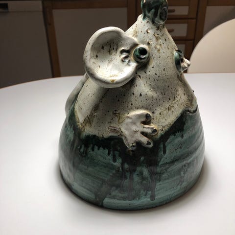 Hvid osteklokke formet som mus, dekoreret med guldfarvede maling. Længde 23 cm, bredde op til 16 cm, højde 12 cm. Der et et lille afslag i kanten på fadet. (Se billederne.)