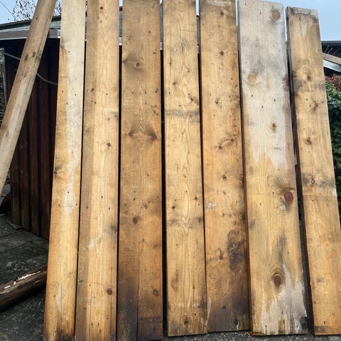 Planker, Fyrretræ. Tykkelse 4 cm Længde 2,30 m bredderne er forskellige og svinger fra 15 cm til 40 cm. Har ligget helt tør. Er helt ok. Velegnet til evt. plankebord, bar disk, hylder, senge gavl, trappe eller lign.