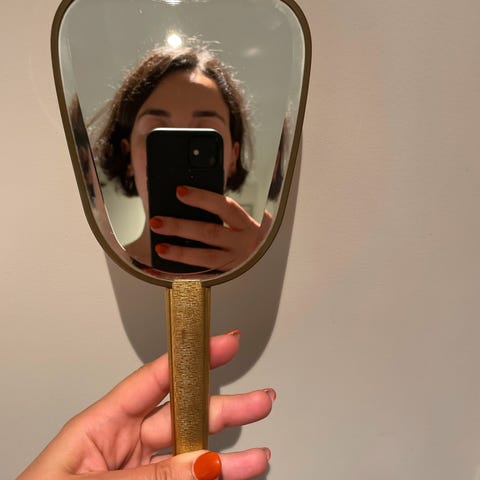Håndspejl, Smukt antik art nouveau håndspejl med facetslebet rosa spejl på den ene side og alm på den anden. Super flot til fx toiletbordet.