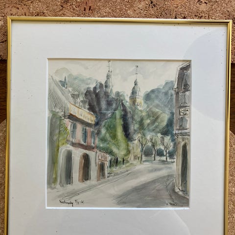 Akvarel /Oliekridt ? , N. Graversen, Lille billede i glas og ramme. Akvarel eller oliekridt. Motivet kunne evt være Randers Banegaard. Signeret N.Graversen 1938. Rammemål 25x18,5.
