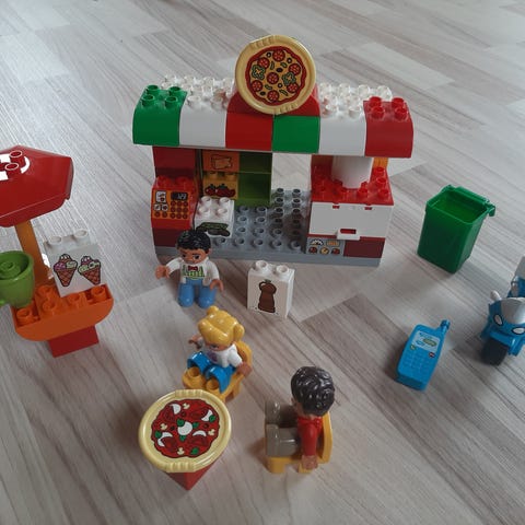 Lego Duplo, 10834, Pizzaria med udbringning på motorcykel og spiseområde, skraldespand mm.
