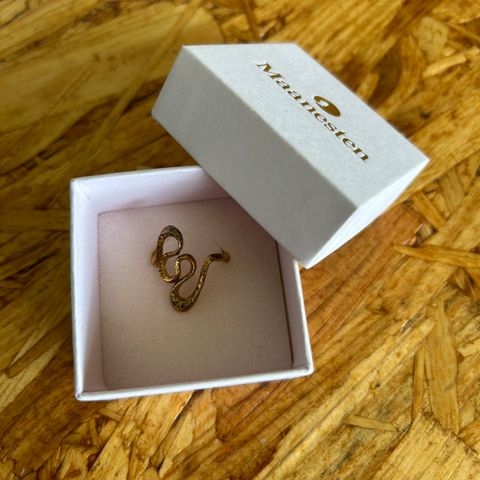 Fingerring, forgyldt, Maanesten, Fejlkøb Gudindering Prehnit Elinor model str 45, nypris 800kr, sælges billigt pga lille hak, der kan ses men ikke mærkes når ring er på. Se billede 4, nærbillede.