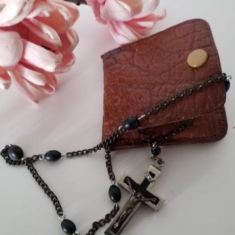 Rosenkrans, Stor, Stor smuk Rosenkrans med varm lys brun trækrors, hjerte og kugler og råhvid bomuldssnor