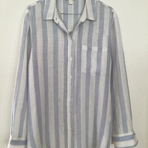 Bluse uden ærmer i luftig, vævet bomuldskvalitet. Blusen har krave og knapper foroven samt rundet kant forneden.