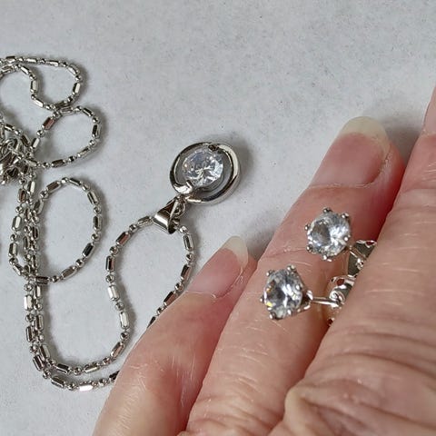 naturlige cirkoner. Vedhæng - L 21 mm, B 12 mm. Halskæde 50 cm lang.