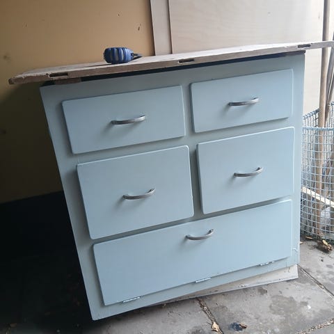 Vintage køkken skab lavet af træ, malet hvidt. Skabet har flere skabe og skuffer til opbevaring, velegnet til køkkenbrug.