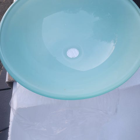 Glas håndvask inklusiv metalfod, helt ny håndvask i hærdet glas inklusiv hærdet buet (halvrund) glasbord, trefodet metalben og afløb - aldrig taget i brug og i original indpakning. 250kr.