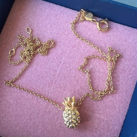 Halskæde, forgyldt, Sistir, Halskæden er produceret i sterlingsølv forgyldt med 18 karat guld og er pyntet med små ananasser og blade. Smykket er fra Anna Briand x Sistie kollektionen, der er designet i samarbejde med Youtuber og Influenser Anna Briand.