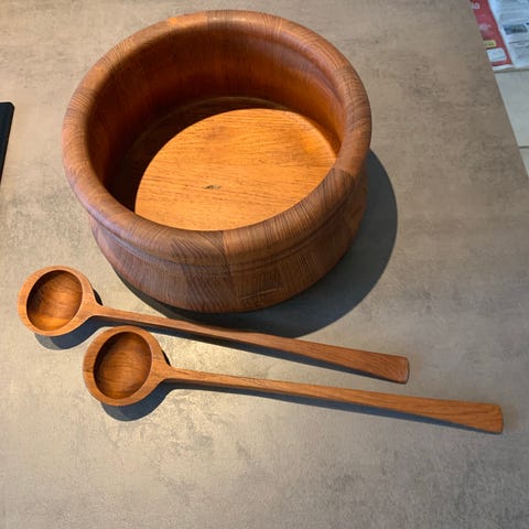 Køkkenudstyr, Salatskål Nissen Danmark, Salatskål i stavlimet bøg. Design: Richard Nissen.