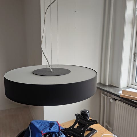 Pendel, Philips, Ubrugt i farve gul.Fra HUE-serien. Lampe i plast ø26 cm, kop til loft i metal. Ialt ca 1,5 m stofledning. Opnåede iF product design Award 2012.