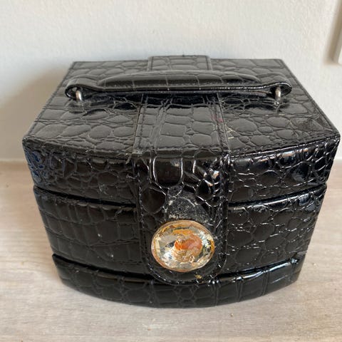 Smykkeskrin med sort skinbelagt overflade (jeg ved ikke om det er ægte skind) og indsats i plys/filt.