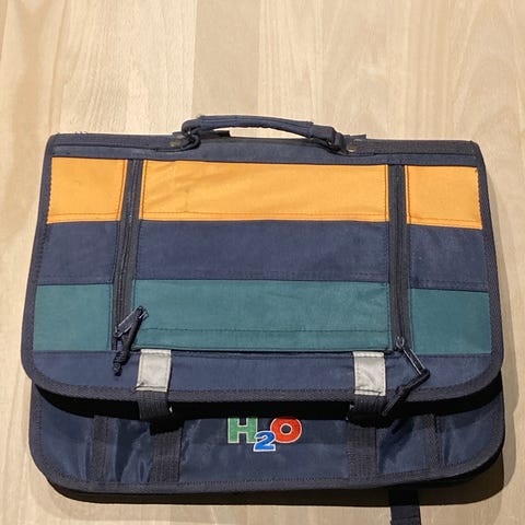 Andet, H2O, b: 40 l: 8 h: 37, Retro rygsæk fra 1990’erne fra H2O, med de klassiske H2O striber i rød hvid og blå. Der er plads til en computer i rygsækken, men det er ikke det den er beregnet til. Kan også bruges som skoletaske. Er i rigtig fin stand, og kommer fra et ikke ryger hjem.
