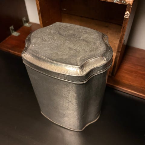 Metaldåse, Antik norsk slikdåse, Fin antik dåse oval 10 cm høj , pæn og velholdt