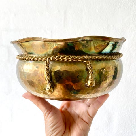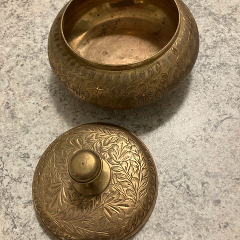2 - vintage skål med håndtag og håndskårede floramotiver; massiv messing. Indien. Graveret i bunden- 3519, INDIA. Vægt 250 gr. Flot stand.