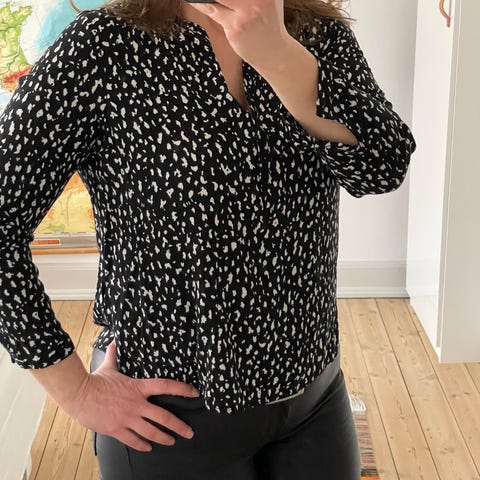 Bluse i størrelse 38. Passer til kvinder og har et mønster, der tilføjer et unikt udtryk. Velegnet til forskellige lejligheder.