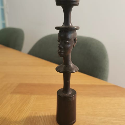 Lysestage: Træ-pige i egnsdragt. Ældre træfigur med plads til lille lys i håret.