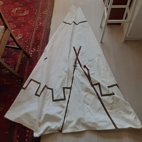 Skønt telt (tipi) fra Bobles, lige til at klikke sammen og stille op, hvor man vil. Kan bruges både inde og ude. Teltet er grundigt rengjort med neutral sæbe, skyllet og tørret og klar til masser af skøn leg. Nypris: 1.000 kr.