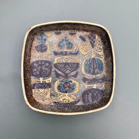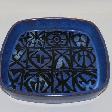 Skålen er designet af Nils Thorsson for Aluminia / Royal Copenhagen.