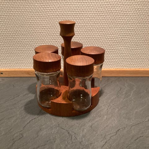 Teak, dansk Digsmed krydderi dispenser holder.