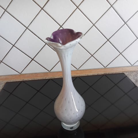 Fin orkidevase, klar glas m/blæreoptik. Fra svenske Kosta Glasbruk. Højde 15 cm. Fra 1950’erne. Meget fin stand med et lille bitte afslag i bunden (kan vanskeligt gengives på foto), ren og pæn.