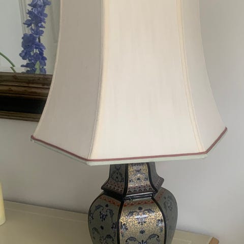TO LAMPESKÆRME, MEGET FIN STAND. MÅLENE: H. 33 CM (ØVERST 19X19 CM, NEDERST 32X32 CM.) SÆLGES PGA FLYTNING.