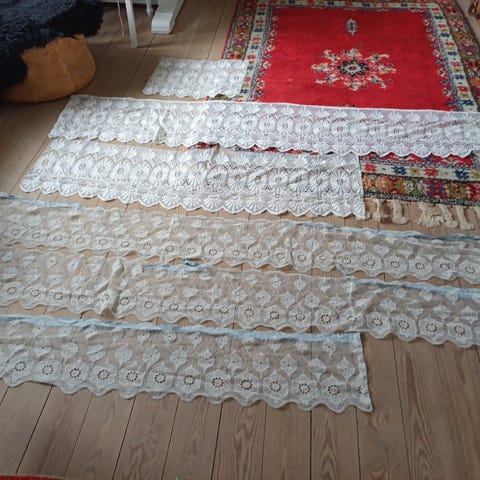 Blonde, Bred blondekant 190cm lang, Kan evt bruges som kant på nederdel. 190cm lang hvid broderet feston, mellemværk, broderi anglaise, flæse bredde 30cm. Jeg har flere annoncer med lyseduge, blondeduge som vist på sidste foto. Evt søg på: ksø blondeduge.