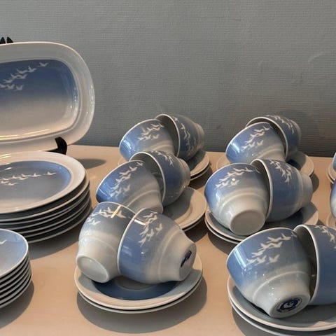 Porcelæn, Sæt med 12 stk dybe tallerkener fra firkløveren nordiske fugle og 8 stk små kopper dybe tallerkener 1800 kroner små kopper 600 kroner tilsammen 2250 kroner