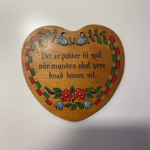 Træhjerte, Politisk ukorrekt - men måske derfor ekstra sjov !. Fint rødt træhjerte med budskab om hvordan man overlever krise i ægteskabet ??. 12x12cm og med alderspatina. Pris kr 35.