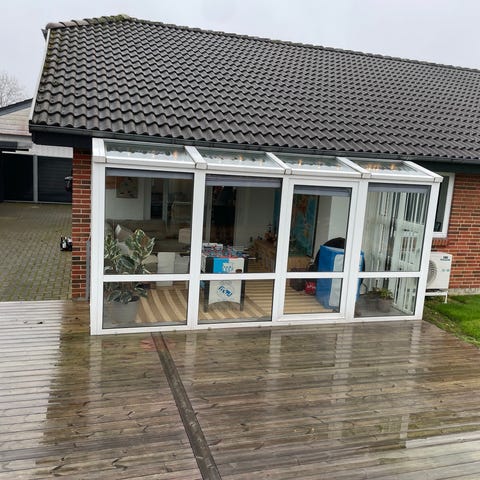 Udestue, alu, b: 400 h: 300, hvid aluminiumsudestue 3x4 mtr. = 12m2 med skydedøre i front og i siden samt tophængt vindue og gardiner