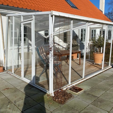 Udestue, alu, b: 400 h: 300, hvid aluminiumsudestue 3x4 mtr. = 12m2 med skydedøre i front og i siden samt tophængt vindue og gardiner Højde ved mur 260cm.