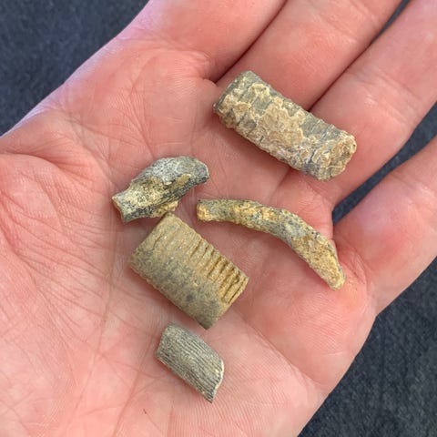 Fossiler, Brakiopoder er et nu næsten uddødt krebsdyr, der bygger musling-lignende skaller, men som ellers intet har med muslinger, at gøre. DEN ER I RIGTIG FIN STAND OG SVÆRE AT FINDE ø 3cm og 1,5 cm høj