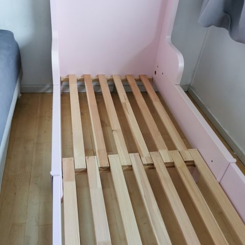 Juniorseng, Udtræksseng, Super fin seng som kan trækkes ud til forskelllige længder - kan også bruges af en voksen på cirka 165cm. Sengen er udvendig mål ca 87x120-210. Indvendig mål ca. 80x113-205