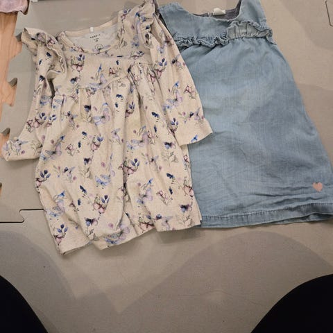 Lyserød kjole med sorte prikker fra name it og en blomstret kjole fra VRS.